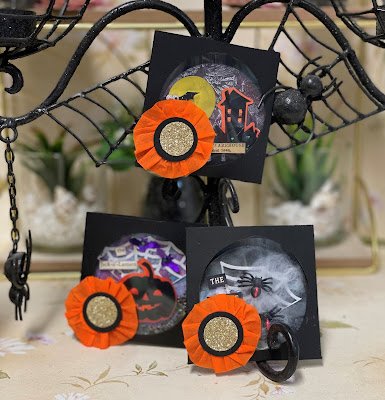 This swap was for three ATCoins which is Artist Trading Coins. They measure 2 1/2 inches round and the swap was for Halloween. I created these and made pockets to house them in. I added a flower made from crepe paper with a gold sparkly centre. Tooo much fun to have..